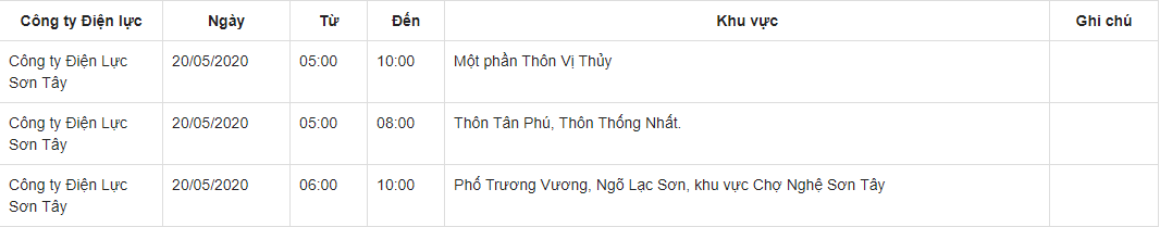 Lịch cắt điện tại Thành Phố Sơn Tây