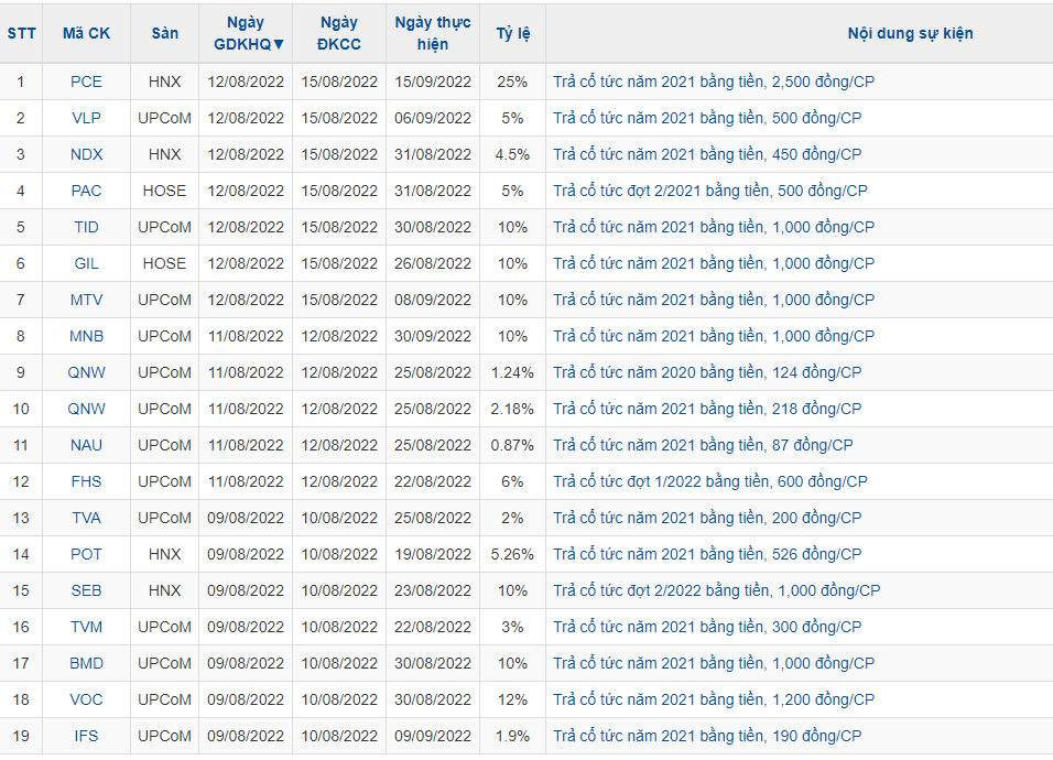 Tuần từ 8/8- 12/8, trên thị trường chứng khoán Việt Nam có 19 doanh nghiệp chốt quyền nhận cổ tức bằng tiền mặt. Trong số đó doanh nghiệp trả cổ tức tỷ lệ cao như CTCP Phân bón và Hóa chất Dầu khí Miền Trung (PCE ) trả tỷ lệ 25%.