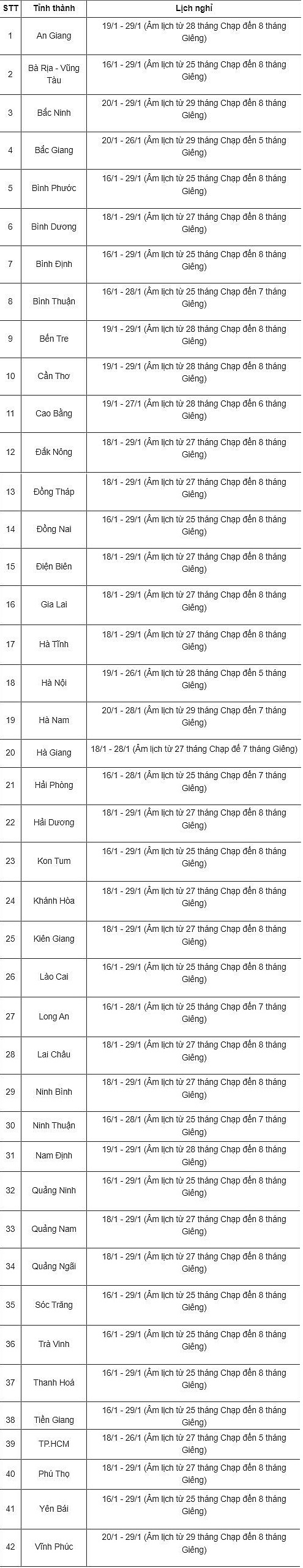 Lịch nghỉ Tết Nguyên đán của học sinh 42 tỉnh, thành phố như sau: