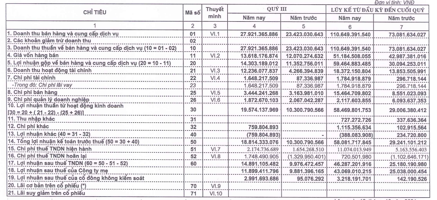 Khấu trừ chi phí, lợi nhuận sau thuế gần 15 tỷ đồng, tăng 50% so với quý 3/202