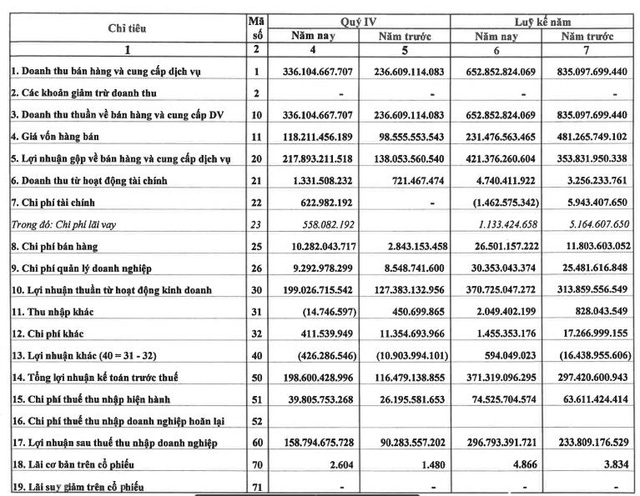 Theo đó, tính riêng quý 4 doanh thu thuần đạt 336,1 tỷ đồng, tăng 42% so với cùng kỳ năm 2019, tuy nhiên chi phí giá vốn tăng thấp hơn mức tăng doanh thu, tăng 20% nên lợi nhuận gộp thu về tăng gần 58% so với cùng kỳ 2019, ghi nhận 217,9 tỷ đồng.