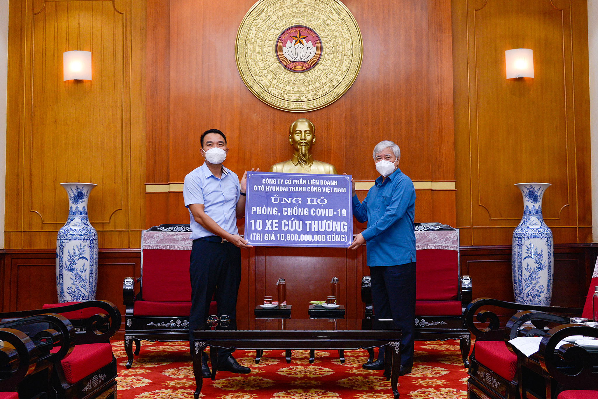 Để tiếp sức cho đội ngũ y tế trên tuyến đầu chống dịch Covid-19, Liên doanh Ô tô Hyundai Thành Công Việt Nam đã quyết định trao tặng 10 xe Solati cứu thương cho các cơ sở y tế thông qua Mặt trận Tổ quốc Việt Nam, tương ứng tổng giá trị là 10 tỷ 800 triệu đồng. Danh sách trao tặng bao gồm: