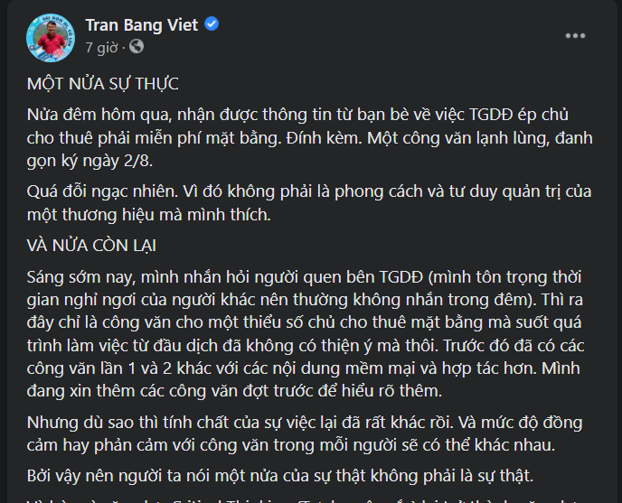 Chia sẻ của ông Trần Việt Bằng trên trang cá nhân về những "sự thực" chưa được tiết lộ đằng sau văn bản gây tranh cãi của Thế giới Di động