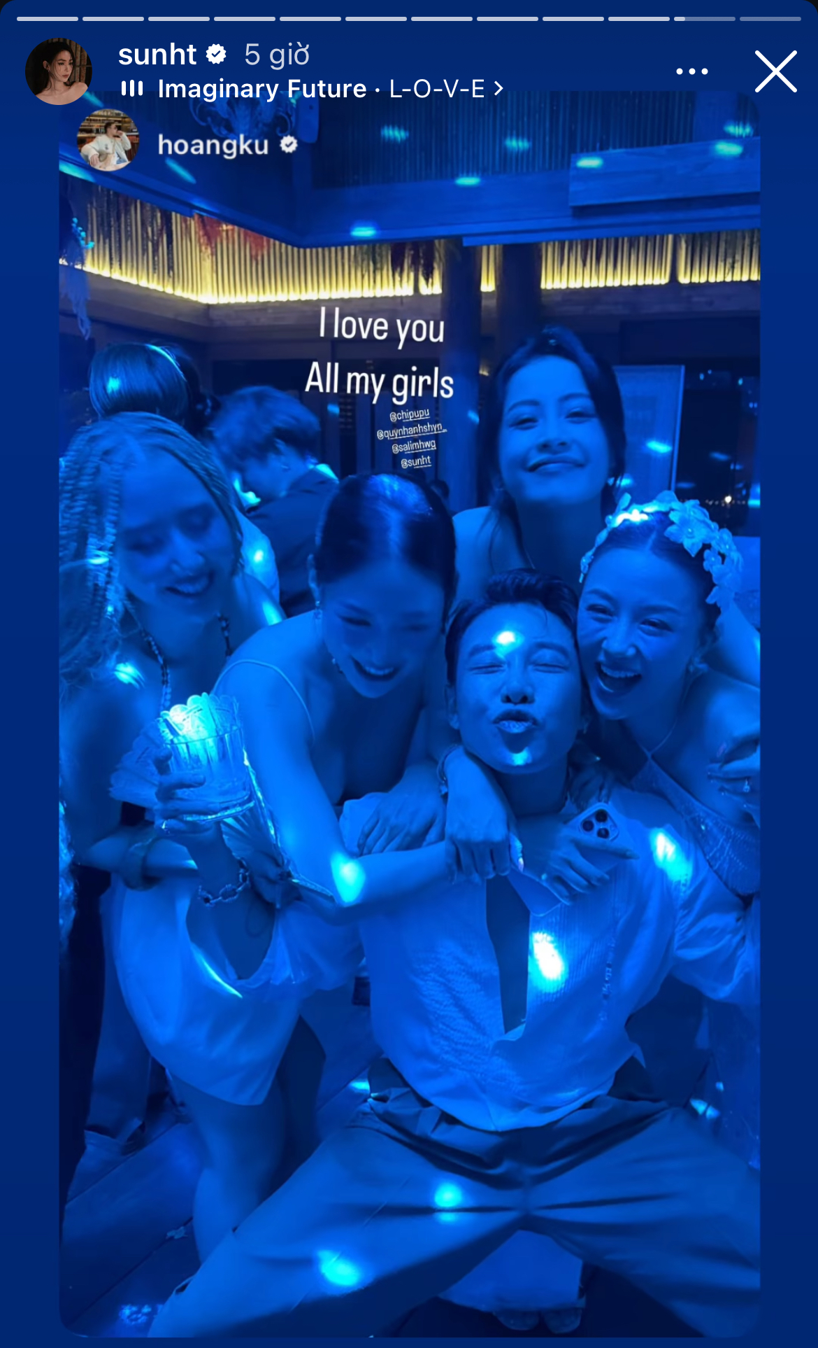 Nhưng chỉ ngay sau đó người đẹp đã "quậy tung" khi cùng Chi Pu nhảy mún, nâng ly gắn bó như chưa từng có cuộc ồn ào nghỉ chơi. Không chỉ thế, Chi Pu còn chủ động ôm và hôn má bạn thân khiến Hoàng Ku phải cảm thán "Sau tất cả, tình yêu là sự kết nối nhỉ?".