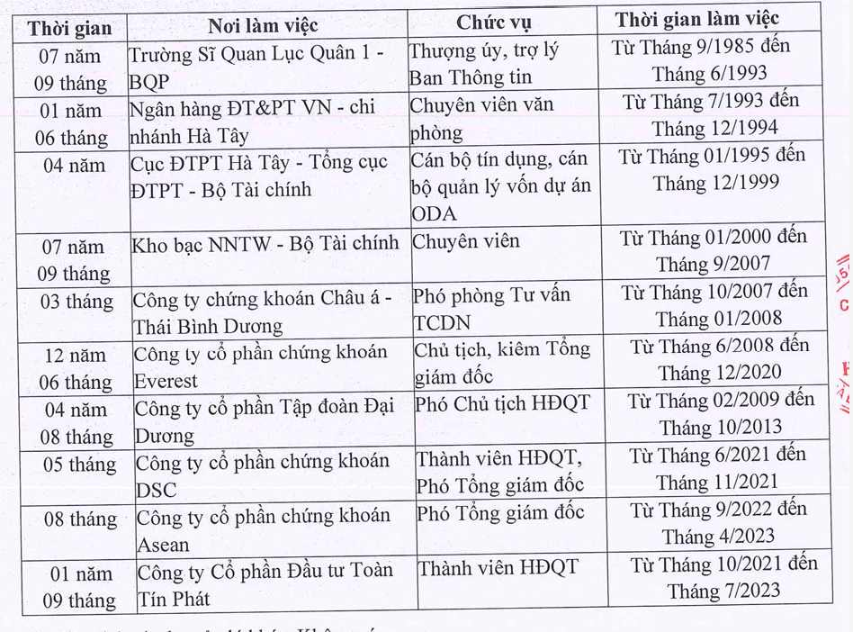 Cụ thể, từ năm 2007 – 2020, ông đảm nhận vị trí Chủ tịch HĐQT, kiêm Tổng giám đốc tại CTCP Chứng khoán Everest (EVS); Thành viên HĐQT kiêm Phó Tổng giám đốc CTCP Chứng khoán DSC (từ 6/2021 – 11/2021), Phó Tổng Giám đốc CTCP Chứng khoán ASEAN (Từ tháng 9/2022 – tháng 4/2023).