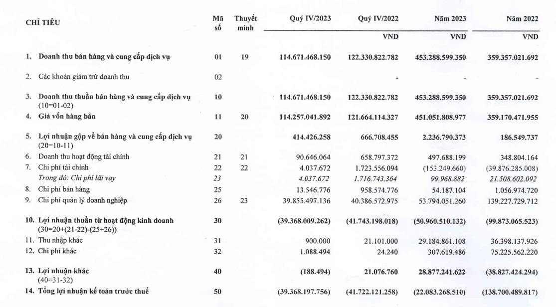 Tại ngày 31/12/2023, số lỗ lũy kế tính của Công ty lên hơn 242 tỷ đồng. Vốn chủ sở hữu tiếp tục bị bào mòn còn hơn 463 tỷ đồng.