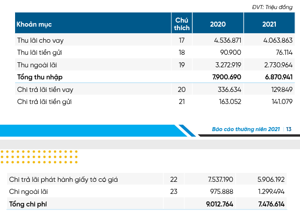 Cụ thể, năm 2021, thu từ lãi của ngân hàng hơn 4.063 tỷ đồng, giảm 10,4%; thu lãi tiền gửi cũng giảm 15% còn 76 tỷ đồng; thu ngoài lãi đạt 2.730 tỷ đồng, giảm 16,5%. Tổng thu nhập hoạt động của VDB đạt 6.871 tỷ đồng (giảm 13%).