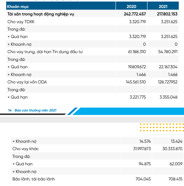 Cụ thể, tính đến hết năm 2021, tổng dư nợ cho vay xuất khẩu của ngân hàng là 3.251 tỷ đồng, thì toàn bộ số dư nợ này là nợ có khả năng mất vốn. Hơn 40% dư nợ cho vay đầu tư trung và dài hạn (hơn 22.100 tỷ đồng) là nợ quá hạn. Hoạt động cho vay lại vốn ODA cũng có tới hơn 3.355 tỷ đồng nợ quá hạn.
