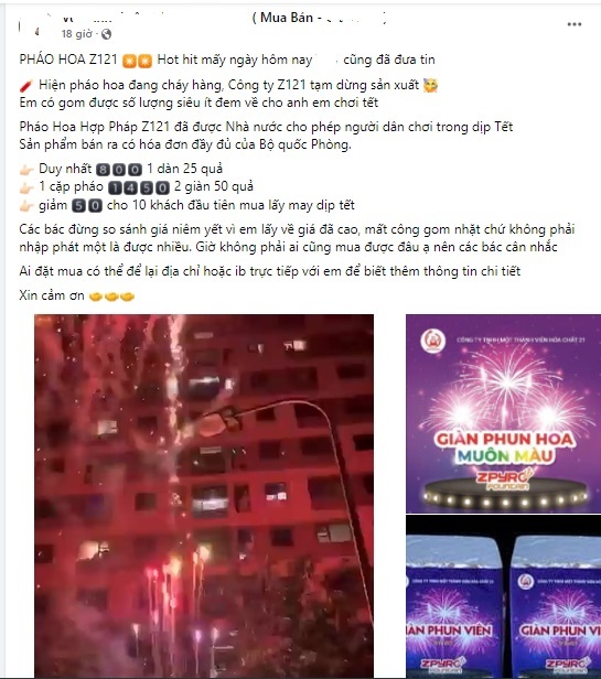 Người bán cũng cho biết, pháo hoa có sẵn giấy tờ đi cùng, hơn nữa khi đốt không có tiếng, lại là loại pháo hoa đã được cấp phép nên không lo.Trong vai cần mua giàn pháo hoa để sử dụng dịp Tết, PV Infonet đã liên hệ với một người tên Q. ở Nam Định đang rao bán với giá 900.000 đồng/giàn pháo hoa của nhà máy Z121, người tên Q. này cho biết, hiện pháo hoa về đã bán hết hàng và nếu đồng ý mua thì chờ thêm 2 ngày nữa có hàng sẽ ship tận nơi, phí vận chuyển người mua tự thanh toán thêm với bên vận chuyển.