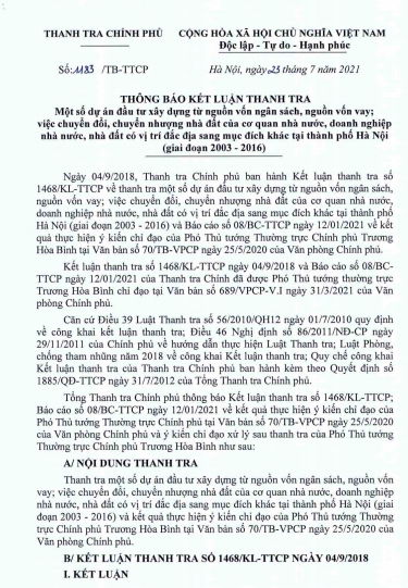 TTCP vừa thông báo kết luận thanh tra một số dự án đầu tư xây dựng từ nguồn vốn ngân sách, nguồn vốn vay, việc chuyển đổi, chuyển nhượng nhà đất của cơ quan nhà nước, doanh nghiệp nhà nước, nhà đất có vị trí đắc địa sang mục đích khác tại TP Hà Nội.