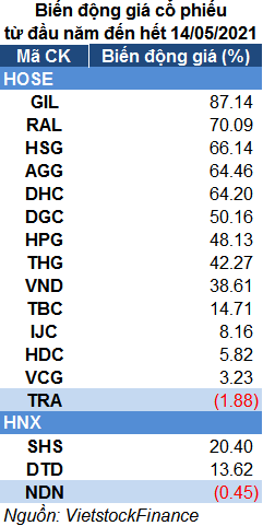 Từ đầu năm đến nay (tính đến hết phiên 14/05/2021), hầu hết mã cổ phiếu trên đều tăng giá, nhiều mã tăng trên 50%.