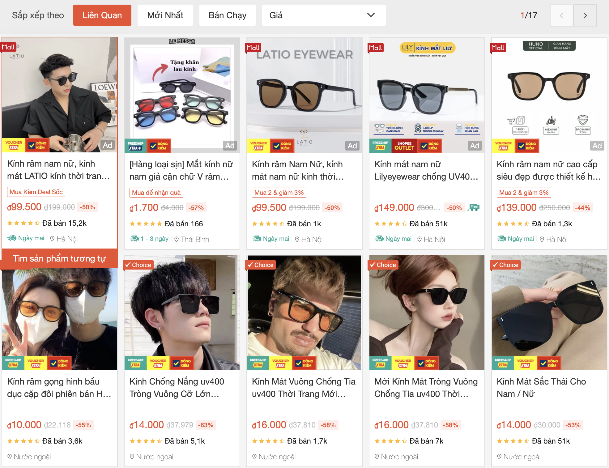 Khảo sát của PV Thương Trường trên sàn thương mại điện tử Shoppe cho thấy, nhiều sản phẩm kính râm với các kiểu dáng, mẫu mã đa dạng và phong phú như: kính mắt mèo, kính mắt vuông, kính mắt tròn, kính hình oval…