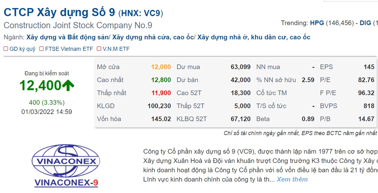 Chốt phiên giao dịch ngày 28/2 cổ phiếu VC9 đứng ở thị giá 12.000 đồng/cổ phiếu.