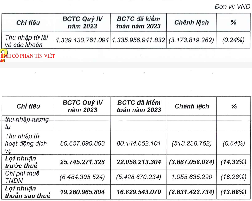Sau những điều chỉnh trên, lợi nhuận sau thuế đã kiểm toán năm 2023 của VietCredit đã giảm 74% so năm 2022.