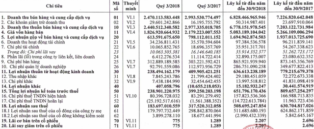 Tính riêng 9 tháng đầu năm 2018, Habeco ghi nhận 511,7 tỷ đồng lợi nhuận sau thuế, giảm 18%. Thu nhập trên mỗi cổ phần (EPS) 9 tháng đạt 2.207 đồng