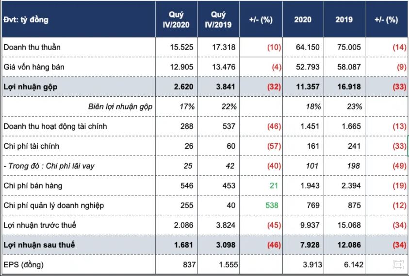 Năm 2020, tổng công ty đạt 64.150 tỷ đồng doanh thu thuần, 7.928 tỷ đồng lãi sau thuế; giảm lần lượt 14% và 34% so với năm 2019. Mức lợi nhuận năm 2020 ghi nhận thấp nhất trong 4 năm trở lại đây.