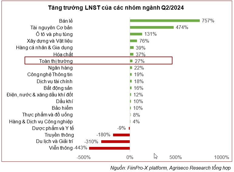 Nguyên nhân Khối phi tài chính có mức tăng lợi nhuận cao đến từ nhóm Bán lẻ, Thép, CNTT và Xây dựng phục hồi đáng kể từ mức nền thấp so với cùng kỳ năm trước. Một số doanh nghiệp có LNST 6T2024 tăng trưởng cao như MWG (+843%), MSN (+75%), HPG (+213%), FPT (+20%), CTD (+208%),... Ngược lại, nhóm Bất động sản vẫn còn gặp khó khăn trong 6 tháng đầu năm nay với LNST đạt 24.000 tỷ đồng (-26% yoy) với các doanh nghiệp như VHM (-51%), VIC (-17%), KBC (-87%), NVL (-461%),...