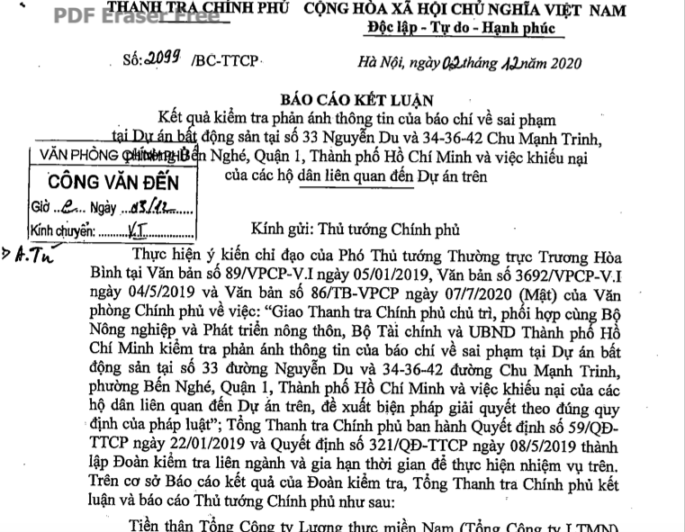 Tại báo cáo Kết luận thanh tra số 2099/BC-TTCP ban hành ngày 2/12/2020, Thanh tra Chính phủ (TTCP) đã chỉ ra hàng loạt sai phạm tại dự án bất động sản số 33 Nguyễn Du và số 34-36-42 Chu Mạnh Trinh, phường Bến Nghé (quận 1, TP.HCM).