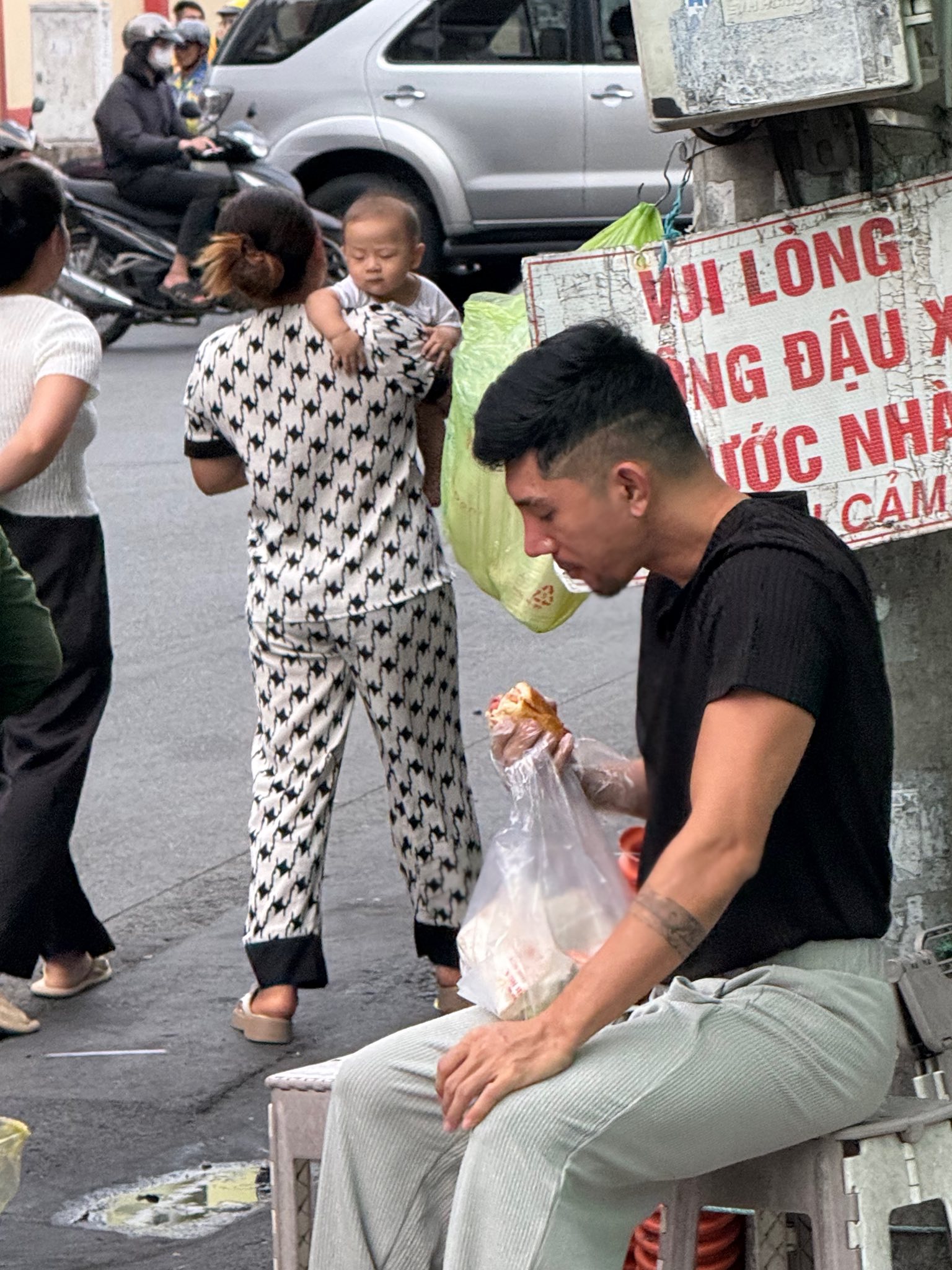 Quang nhìn vào bức hình, thấy một bản thân rất khác - không sân khấu, không ánh đèn, không chỉnh chu. Chỉ là một người đàn ông ngồi ăn vội ổ bánh mì bên lề đường, lặng lẽ giữa dòng đời. Một bữa ăn đơn giản mà ngon, vì đúng lúc đó, Quang cần nó để tiếp tục… làm việc, suy nghĩ, tồn tại.