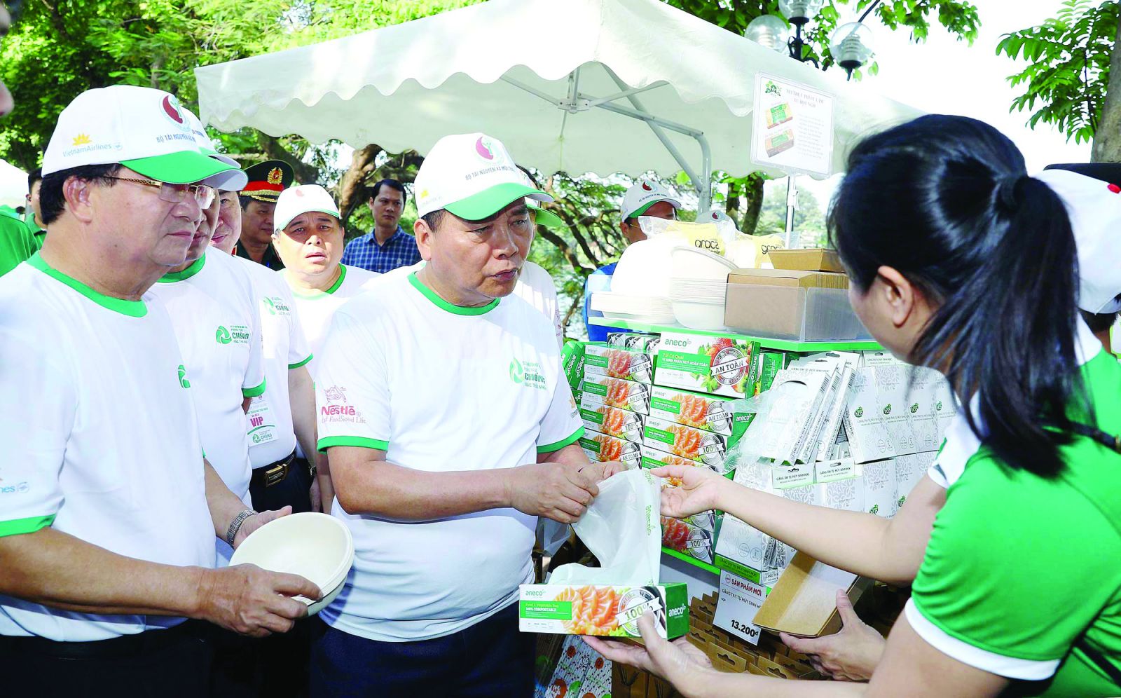 Thủ tướng Nguyễn Xuân Phúc và các đại biểu thăm khu trưng bày các sản phẩm thân thiện môi trường, các giải pháp thay thế nhựa sử dụng một lần và nilon khó phân hủy tại Hà Nội