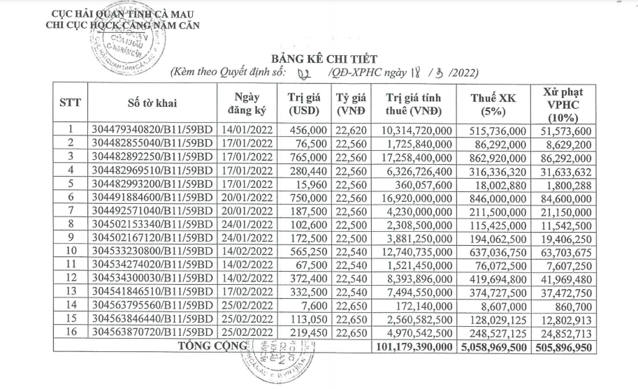 Nguồn: Chi cục HQCK Cảng Năm Căn.