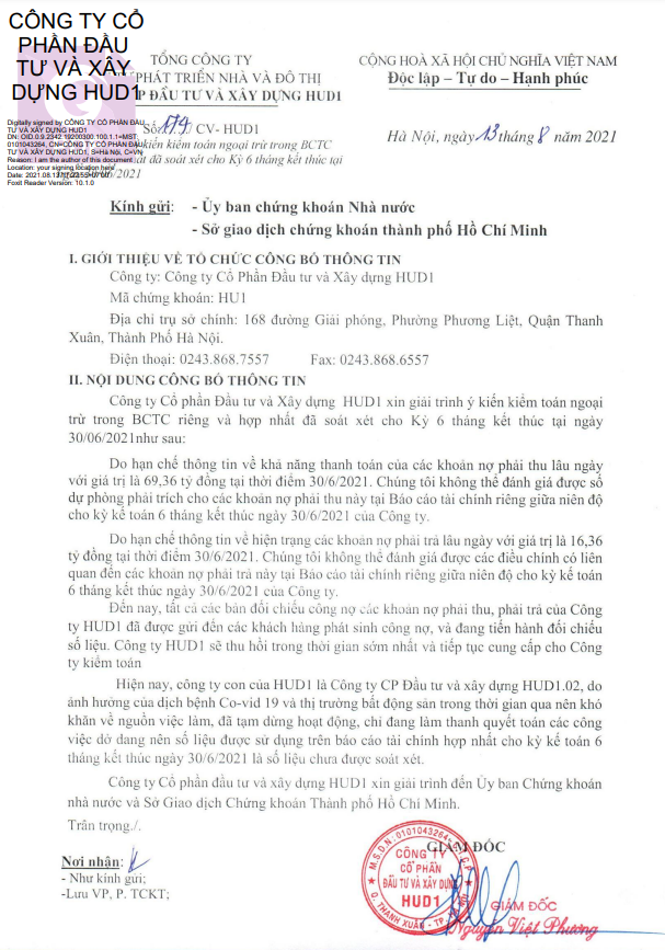 Đáng chú ý, tại BCTC bán niên 2021 của HU1, kiểm toán viên đã đưa ra ý kiến ngoại trừ về các khoản nợ phải thu và nợ phải trả.
