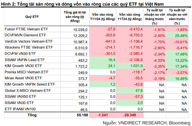Tổng dòng vốn rút ròng lũy kế từ đầu năm đến tháng 11 của các ETF là hơn 20.300 tỷ đồng. Dòng vốn ETF bị rút ròng trong tháng 11 chủ yếu đến từ VanEck Vector Vietnam ETF (VNM ETF) (rút ròng 641 tỷ đồng), DCVFM VN30 ETF (hơn 300 tỷ đồng), Xtrackers FTSE Vietnam ETF (FTSE ETF) (214 tỷ đồng) và DCVFMVN Diamond ETF (203 tỷ đồng).