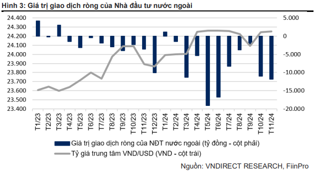 Theo VNDirect Research, kể từ đầu tháng 11, nhà đầu tư nước ngoài đã gia tăng bán ròng trong bối cảnh chỉ số Dollar Index (DXY) tăng mạnh trở lại kể từ khi ông Donald Trump tái đắc cử trong cuộc bầu cử tổng thống Mỹ nhiệm kỳ 2025-2028.