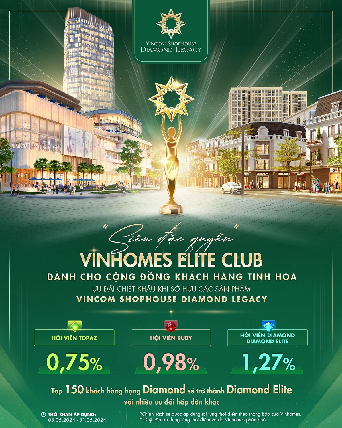 Đặc biệt, khi sở hữu thêm sản phẩm BĐS từ Vincom Diamond Shophouse Diamond Legacy trong tháng 5 này, các gia chủ là thành viên CLB Khách hàng Tinh hoa Vinhomes sẽ có cơ hội hưởng ưu đãi chiết khấu dựa trên tổng số tài sản đang sở hữu, từ 0,75 % - 1,27% tùy theo hạng hội viên.