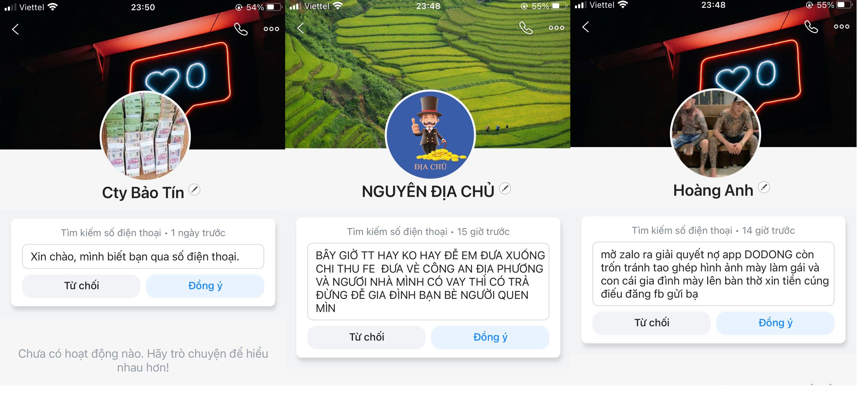 Khi người nợ chậm trả lãi, các đối tượng cho vay quay sang đòi nợ những người trong danh bạ hoặc gửi tin nhắn đe dọa, xúc phạm, bôi nhọ đến những người này. Bước tiếp theo, các đối tượng đòi nợ sử dụng hình ảnh của người vay để cắt ghép thành ảnh nóng và đăng trên các tài khoản mạng xã hội nhằm bôi nhọ danh dự, nhân phẩm và gây áp lực ép người vay phải trả khoản nợ gốc và lãi “cắt cổ”.