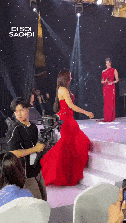 Dù đã sử dụng kĩ thuật đá váy điêu luyện khi bước lên bậc khi catwalk tuy nhiên Mai Ngô trông khá nặng nề khi chọn chiếc đầm khó nhằn với phần đuôi cá cồng kềnh.