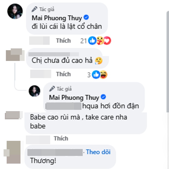 Sau khi liên tục nhận được những tin nhắn hỏi thăm tình hình sức khỏe, Mai Phương Thúy cho biết: "Mình đỡ rồi nhưng vẫn choáng, tuy mệt nhưng có một số việc vẫn phải trực tiếp làm nên sẽ hồi phục chậm hơn chút. Mọi người nhắn tin hỏi thăm mình rất cảm động nhưng mình xin phép đọc và trả lời sau nhé".