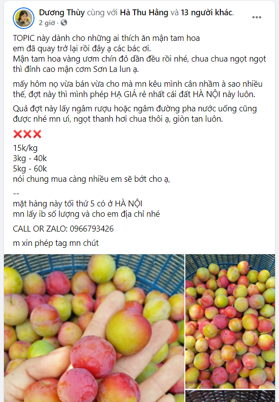 Tại thị trường Hà Nội, chị Thùy Dương (bán mận online tại Hà Đông - Hà Nội) cũng bất ngờ khi giá mận giảm đến mức như vậy. Chị Dương cho biết: "Tôi là người Sơn La nên mọi năm cũng tầm này là bảo gia đình gửi mận xuống Hà Nội để bán. Như mọi năm, giá loại mận rơi vào khoảng 30.000 đồng/kg, có lúc lên đến 100.000 đồng/kg chưa tính phí ship. Nhưng năm nay mận được mùa nên mình chỉ bán 15.000 đồng/kg, 40.000 đồng/3kg và 50.000 đồng/6kg.