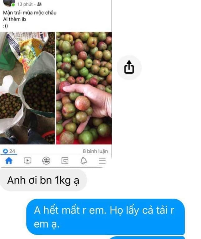 Anh Ba (một tiểu thương bán mận) cho biết: "Đây là thời điểm "vàng" của mận, quả ngon và do tâm lý "thèm mận" hơn nên rất nhiều người hỏi mua, đặc biệt là giới trẻ. Tôi vừa đăng lên Facebook để bán chưa được 30 phút đã hết sạch số mận. Dù có nhiều người hỏi mua nhưng đành phải thông báo cho khách hết hàng. Chỉ mong mận chín sớm hơn một chút để bán được nhiều hơn".
