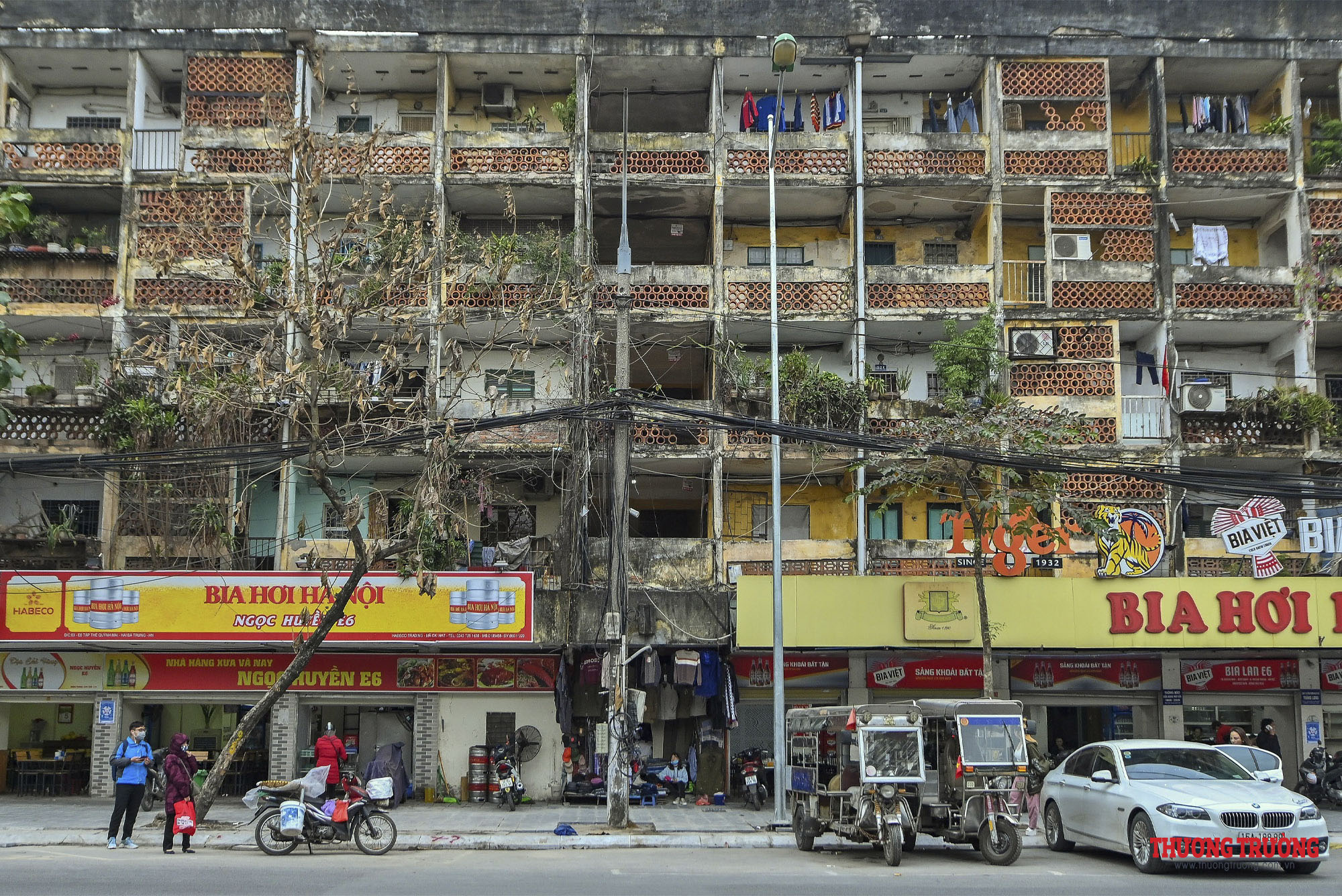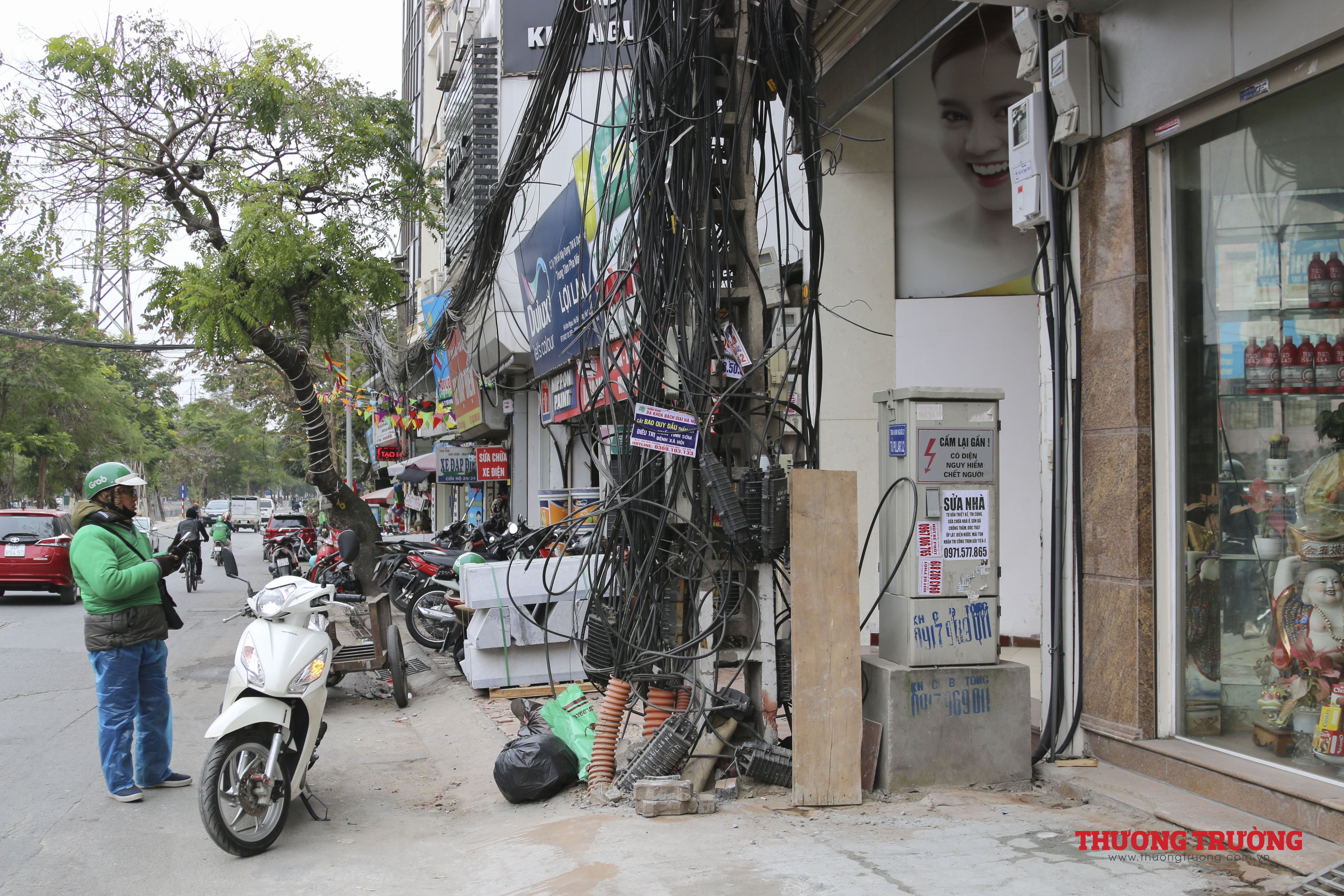 Một đoạn đường đã hoàn thành việc lát lại vỉa hè nhưng dây cáp viễn thông vẫn lơ lửng phía trên. Theo ghi nhận, tình trạng này cũng diễn ra ở nhiều tuyến phố khác của quận Hai Bà Trưng như Nguyễn Bỉnh Khiêm, Tuệ Tĩnh, Trương Định...