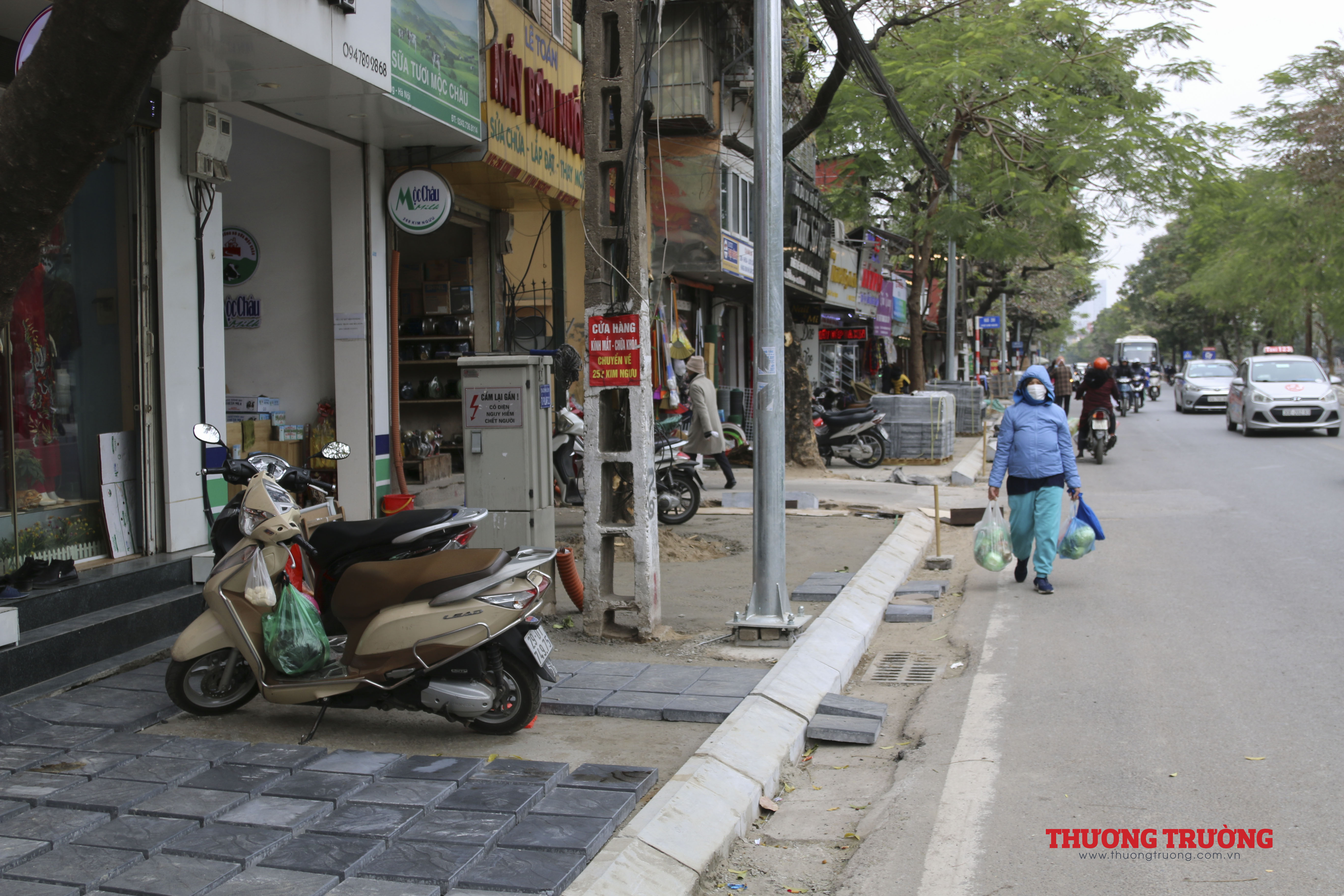 Phố Kim Ngưu dài 2km thế nhưng khi lát vỉa đá vỉa hè việc hạ ngầm dây cáp dường như bị bỏ ngỏ.