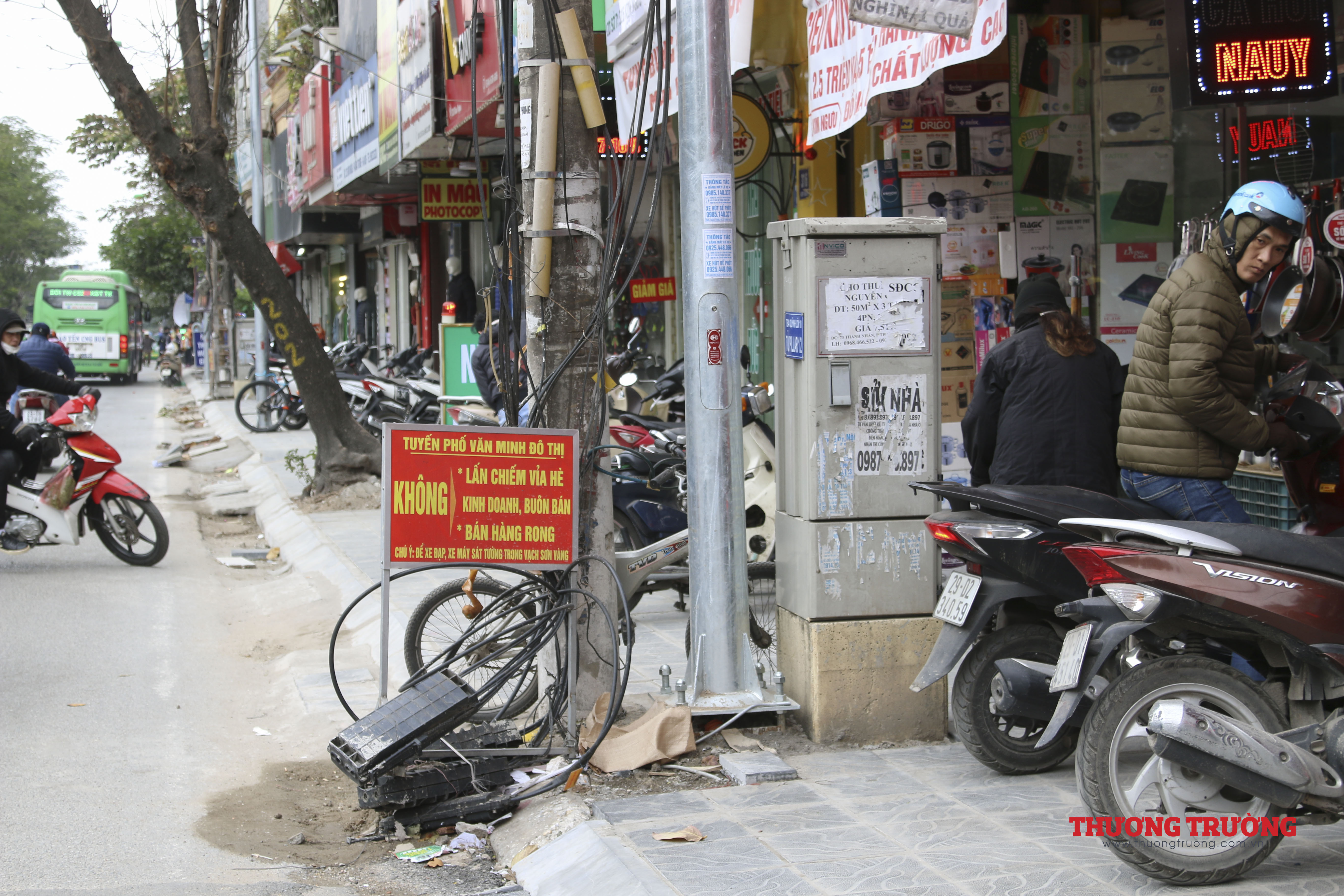Vỉa hè của con phố không còn một khoảng trống khi vật liệu thi công cùng các ngôi nhà mặt đường lấn chiếm làm nơi kinh doanh và để xe máy.