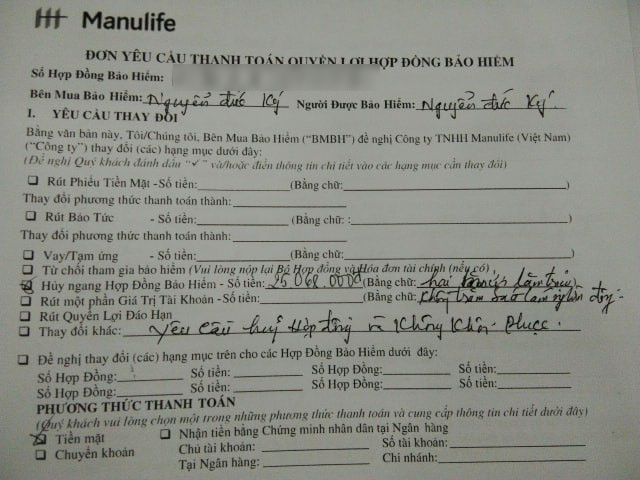 Sau khi về nhà, vợ chồng anh quyết định hủy hợp đồng với Manulife nhưng lạ thay trong hợp đồng không có phần cho khách hàng ghi lý vì do sao hủy.