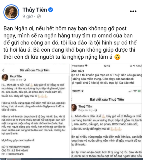 Ngay sau đó, ca sĩ Thủy Tiên viết trên Facebook cá nhân: "Nếu hết hôm nay bạn không gỡ post, mình sẽ ra ngân hàng truy tìm CMND của bạn để gửi công an. Lừa đảo là tội hình sự có thể ở tù hơi lâu đó. Bà con đang khổ bạn không giúp được thì thôi còn đi lừa người ta là nghiệp nặng lắm đó".