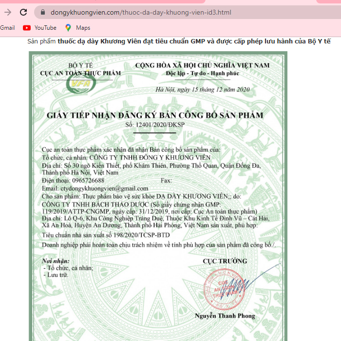 Thế nhưng qua phản ánh của người tiêu dùng, và ghi nhận thực tế của PV Tạp chí Thương Trường tại trang web https://dongykhuongvien.com/, cho thấy sản phẩm Dạ Dày Khương Viên vốn đã được Cục An toàn Thực phẩm (Bộ Y tế) cấp Giấy tiếp nhận đăng ký bản công bố sản phẩm của Công ty TNHH Đông y Khương Viên cho sản phẩm Thực phẩm bảo vệ sức khoẻ Dạ Dày Khương Viên. Thế nhưng trên trang web, cơ sở này đã ngang nhiên “hoá phép” sản phẩm TPBVSK này là “thuốc”. Cụ thể, trang web https://dongykhuongvien.com/, đang giới thiệu là Thuốc dạ dày Khương Viên, có công dụng: “Trị viêm loát dạ dầy cấp và mạn tính, trào ngược dạ dày, HP, đau rát vùng thượng vị. Trị đau đại tràng, đại tràng co thắt, đầy, tức, sôi bụng, chậm tiêu, ợ hơi, ợ chua, đại tiện sống phân, rối loạn tiêu hóa...”.