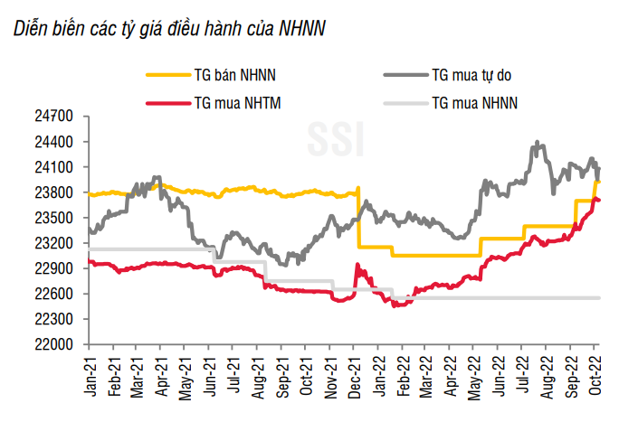 Một số yếu tố hỗ trợ tỷ giá trong ngắn hạn là cung-cầu ngoại tệ trên thị trường có phần nào cải thiện khi cán cân thương mại tháng 9 tiếp tục ghi nhận thặng dư khoảng 1,4 tỷ USD. Bên cạnh đó, chênh lệch dương nới rộng giữa lãi suất VND – USD cũng phần giúp hạn chế xu hướng dòng tiền rút ra khỏi Việt Nam. So với cuối năm 2021, tỷ giá niêm yết tại Vietcombank đã tăng 4,8%, tỷ giá liên ngân hàng tăng 4,6%.