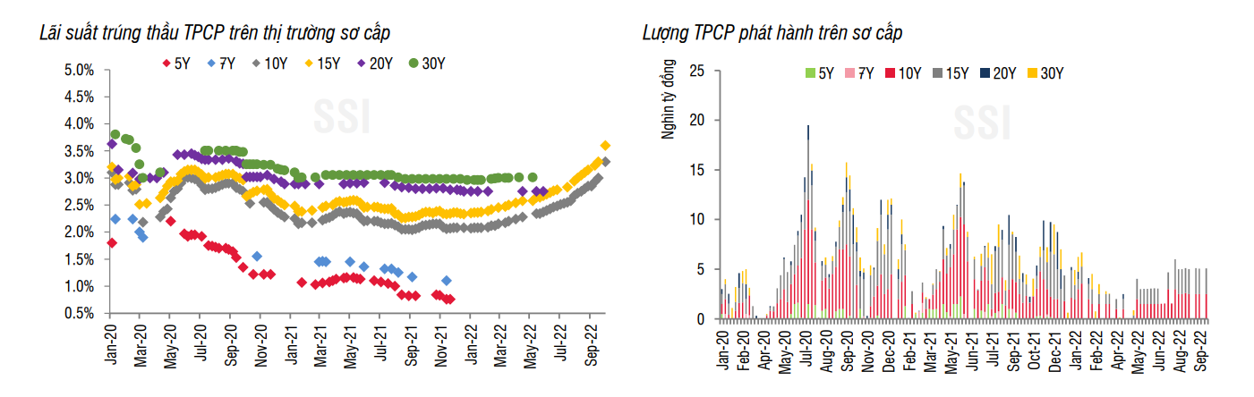 Tính đến hiện tại, KBNN phát hành 119,8 nghìn tỷ đồng, hoàn thành 30% kế hoạch phát hành năm, thấp hơn nhiều so với cùng kỳ. Như vậy, chúng tôi cho rằng KBNN sẽ phải điều chỉnh giảm kế hoạch phát hành năm nhằm phản ánh đúng hơn thực tế trong 3 quý qua và nhiều khả năng, tổng kế hoạch phát hành trong năm 2022 sẽ giảm xuống chỉ còn 250 nghìn tỷ đồng (từ mức 400 nghìn tỷ ban đầu).