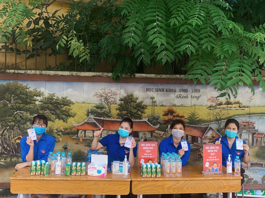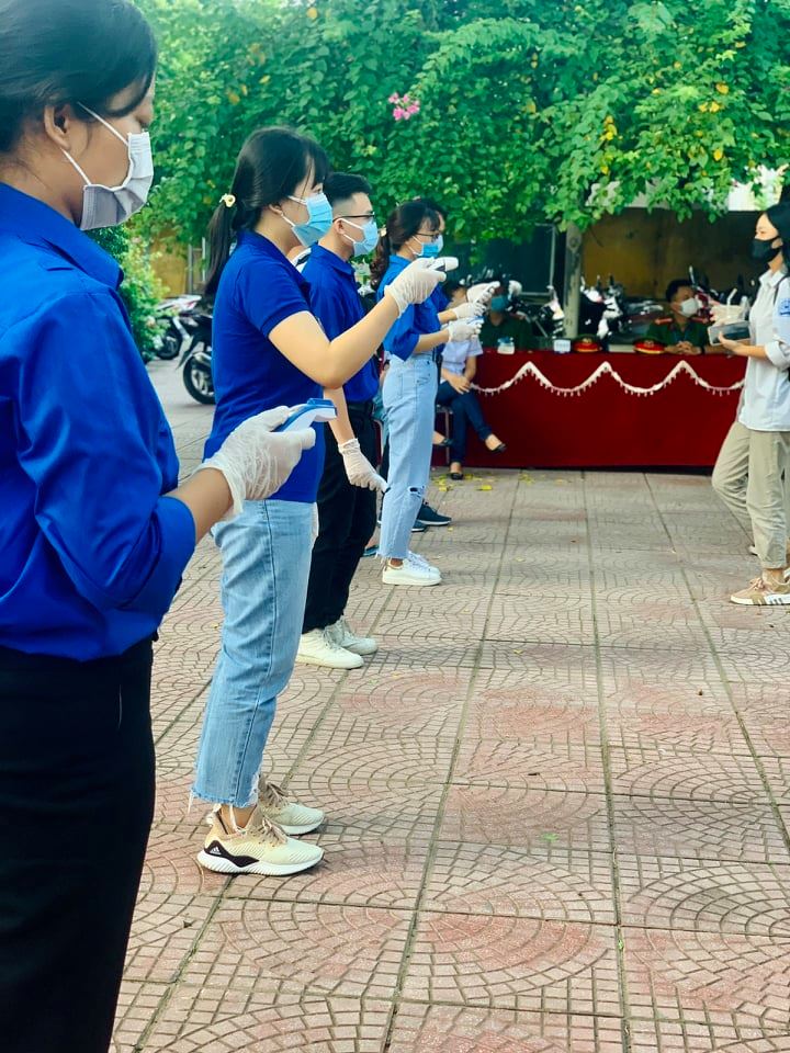 Để đảm bảo kỳ thi diễn ra bảo đảm an toàn, chất lượng thì các bạn tình nguyện cũng chung tay cùng đội ngũ y,bác sĩ trong công tác phòng chống dịch bệnh Covid-19 (Ảnh: Hải Minh).Ngoài việc hỗ trợ nước uống, dụng cụ cần thiết, năm nay tại các điểm thi các bạn tình nguyên viên còn hỗ trợ ban tổ chức, đội ngũ y bác sĩ triển khai việc phát khẩu trang, đo thân nhiệt, sử dụng dung dịch sát khuẩn mỗi khi ra vào địa điểm thi để đảm bảo công tác phòng chống dịch bệnh.