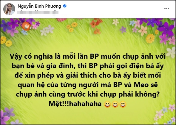 Mới đây, vợ cố diễn viên Đức Tiến là hoa hậu Bình Phương đã đăng tải một dòng trạng thái gây nhiều tranh cãi trên trang cá nhân. Cụ thể, cô chia sẻ: "Vậy có nghĩa là mỗi lần tôi muốn chụp ảnh với bạn bè và gia đình thì phải gọi điện bà ấy để xin phép và giải thích cho biết mối quan hệ của từng người mà tôi và Meo sẽ chụp ảnh cùng trước khi chụp phải không? Mệt, haha".