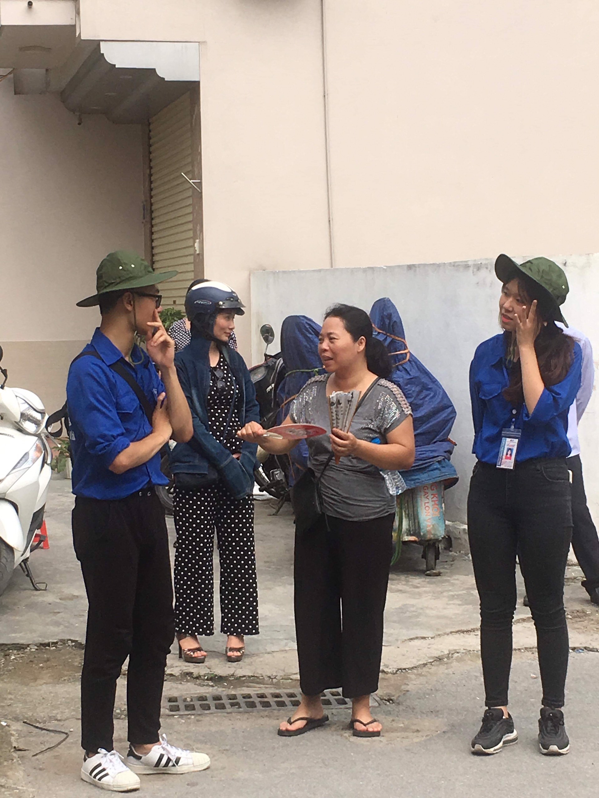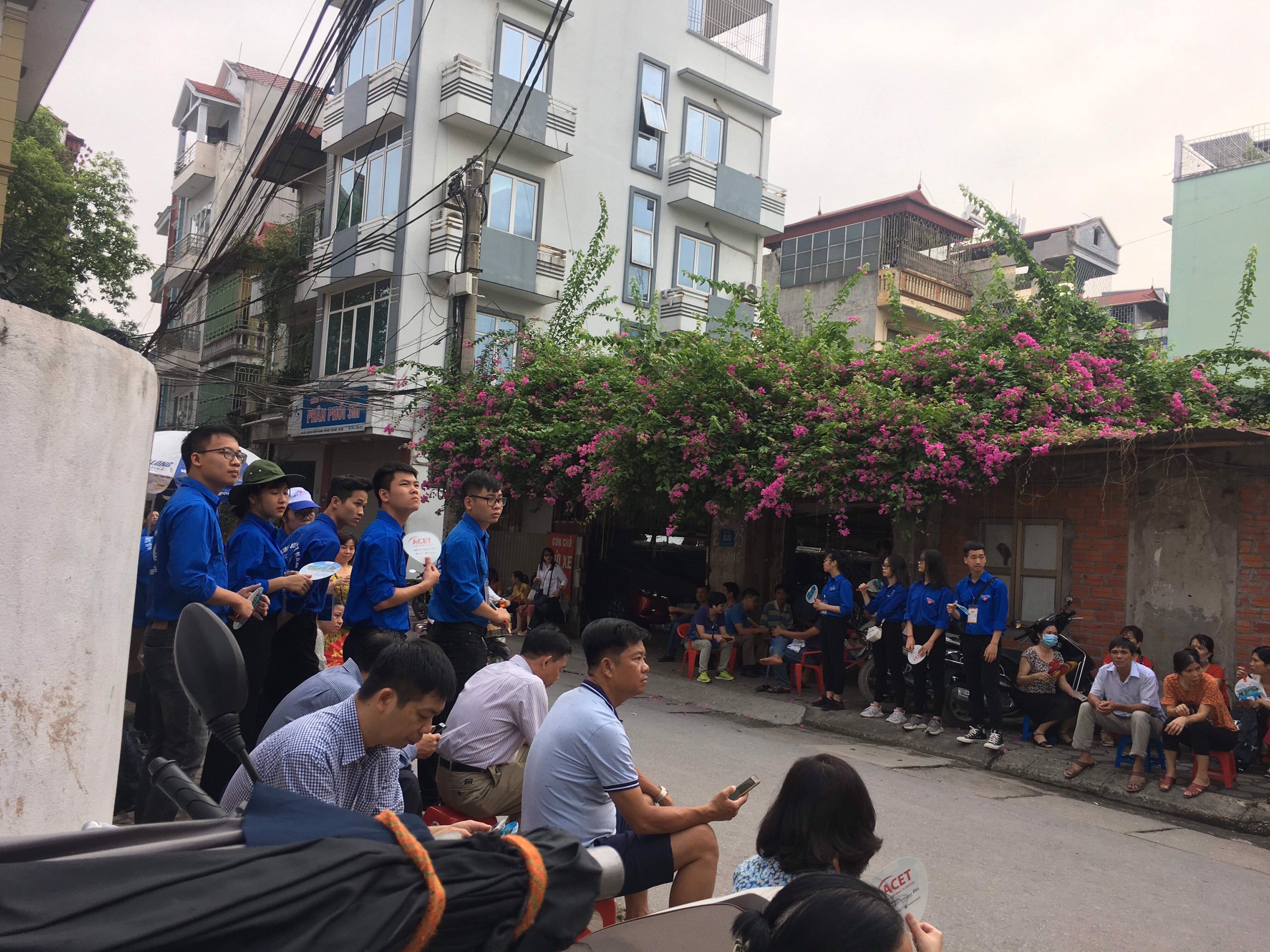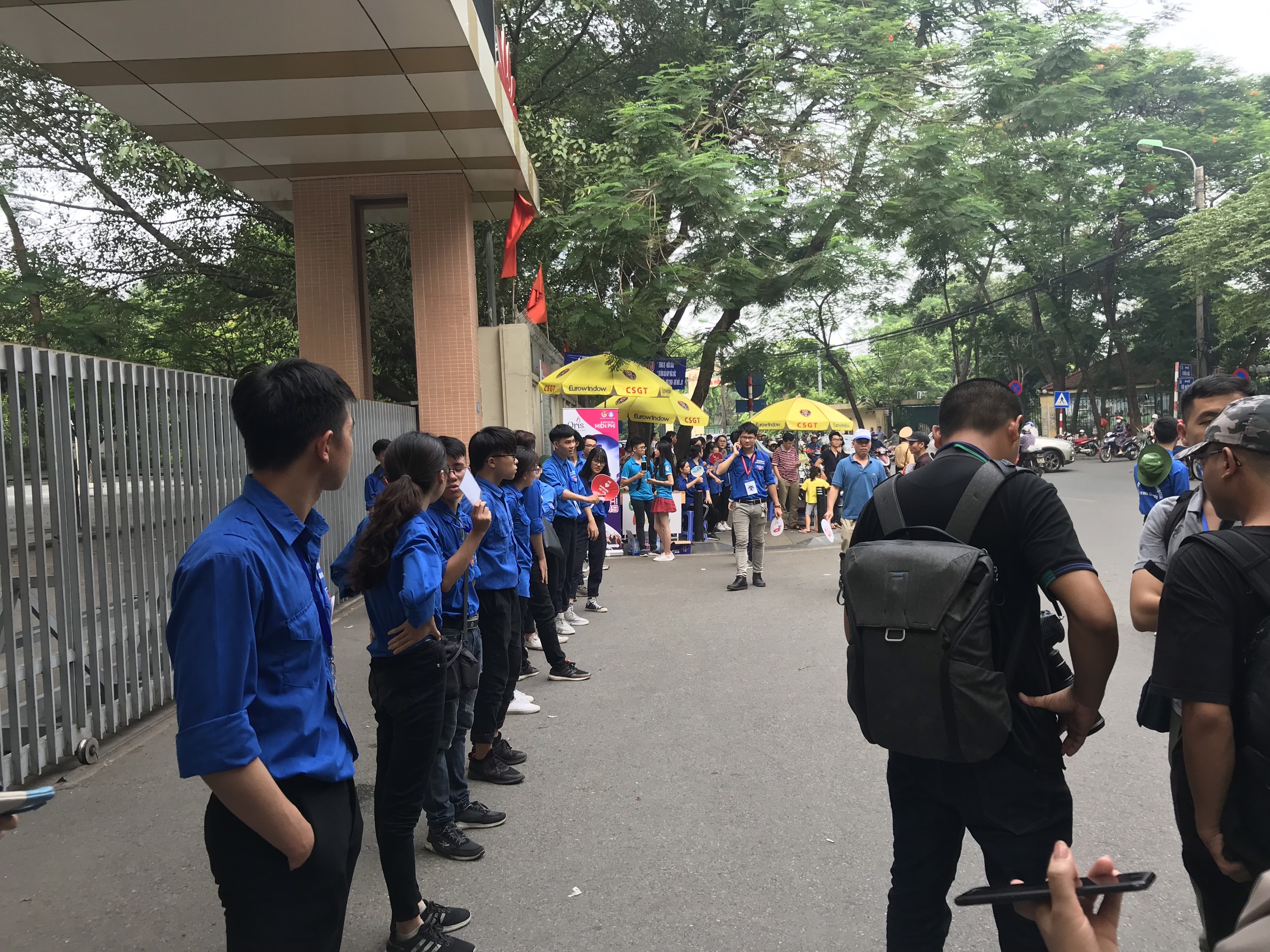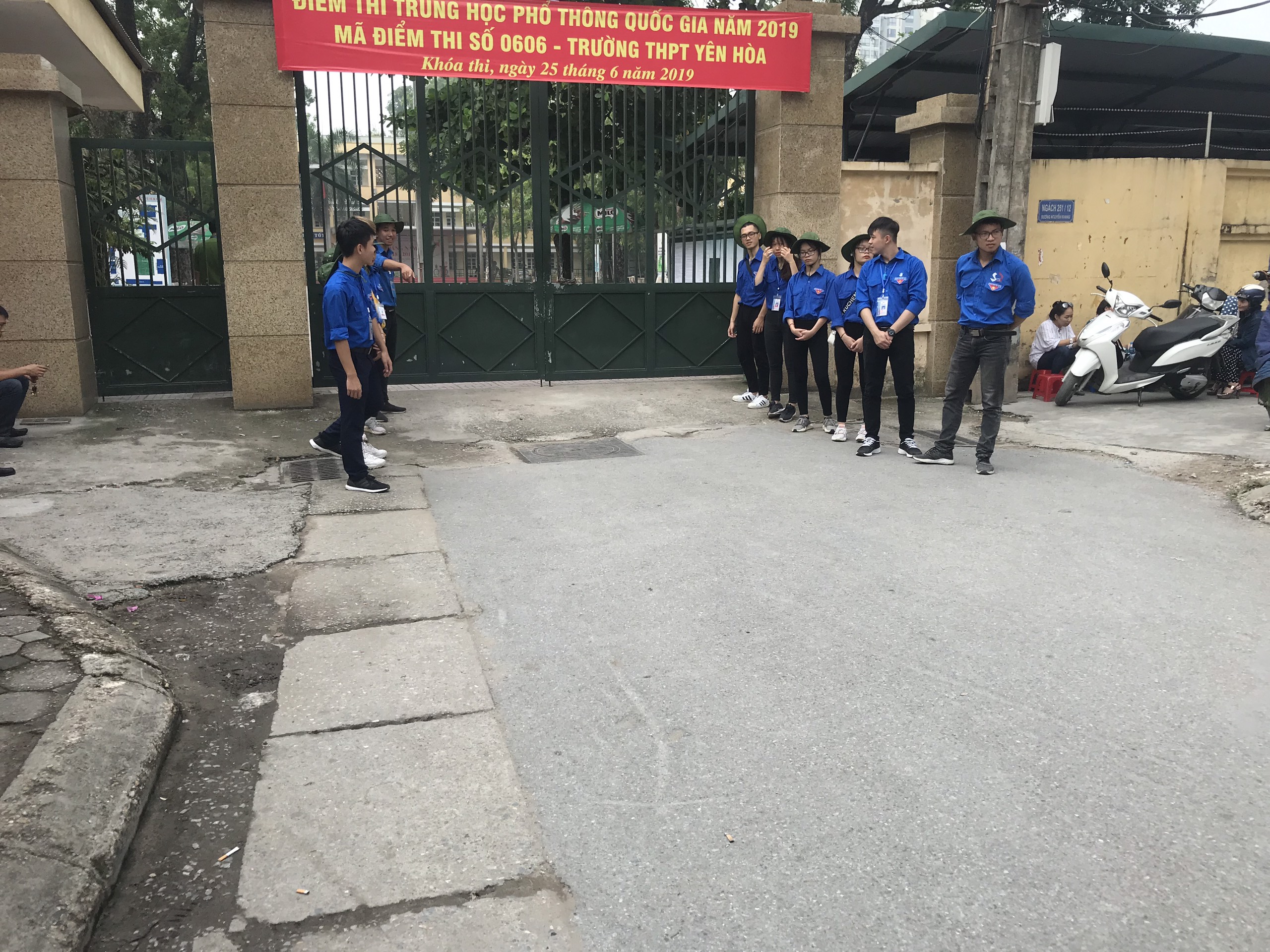 | Các thanh niên tình nguyện đang hỏi han trò chuyện cùng người nhà thí sinh lúc chờ đợi tại điểm thi THPH Yên Hòa. Ảnh: Việt Lâm |