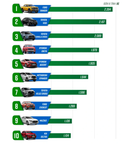 Trong tháng 10/2022, danh sách 10 xe bán chạy nhất thị trường đã có sự xáo trộn đáng kể về thứ tự. Ford Ranger đã bất ngờ vươn lên ngôi vị đầu bảng trong danh sách 10 ô tô bán chạy với 2.394 chiếc.