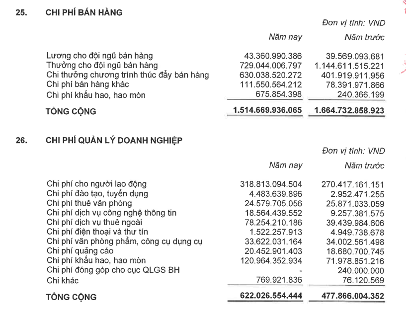 Tuy nhiên, mặt khác công ty lại chi đến hơn 1.500 tỷ đồng cho chi phí bán hàng, trong đó là gần 730 tỷ đồng thưởng cho đội ngũ bán hàng và 630 tỷ đồng chi thưởng chương trình thúc đẩy bán hàng.