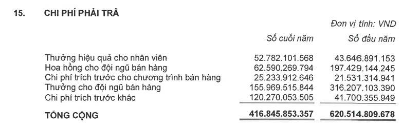 Ngoài ra, chi phí phải trả tại bảng cân đối kế toán của công ty còn ghi nhận hơn 620 tỷ đồng năm 2021 và 416 tỷ đồng cho các chi phí như thưởng hiệu quả cho nhân viên, hoa hồng cho đội ngũ bán hàng, chi phí trả trước cho đội ngũ bán hàng, thưởng cho đội ngũ bán hàng.