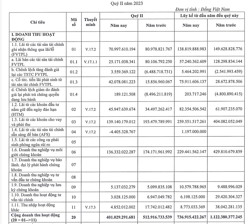 CTCP Chứng khoán MB (HNX: MBS) vừa công bố báo cáo tài chính quý 2/2023 với doanh thu hoạt động chỉ đạt 401 tỷ đồng, giảm 22% so với cùng kỳ. Hầu hết các doanh thu như từ nghiệp vụ môi giới, lãi từ các tài sản tài chính ghi nhận thông qua lãi/lỗ (EVTPL), lãi bán tài sản tài chính... đều giảm.