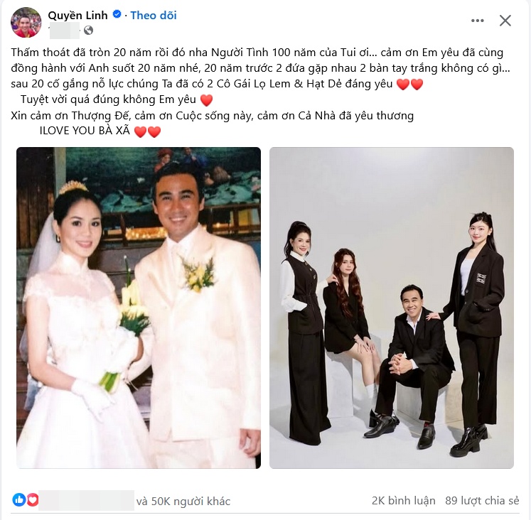 Nam MC đăng hình kèm dòng trạng thái: "Thấm thoát đã tròn 20 năm rồi đó nha Người Tình 100 năm của tui ơi… cảm ơn Em yêu đã cùng đồng hành với Anh suốt 20 năm nhé, 20 năm trước 2 đứa gặp nhau 2 bàn tay trắng không có gì… sau 20 cố gắng nỗ lực chúng Ta đã có 2 Cô Gái Lọ Lem & Hạt Dẻ đáng yêu. Tuyệt vời quá đúng không Em yêu. Xin cảm ơn Thượng Đế, cảm ơn Cuộc sống này, cảm ơn cả nhà đã yêu thương. I love you bà xã".